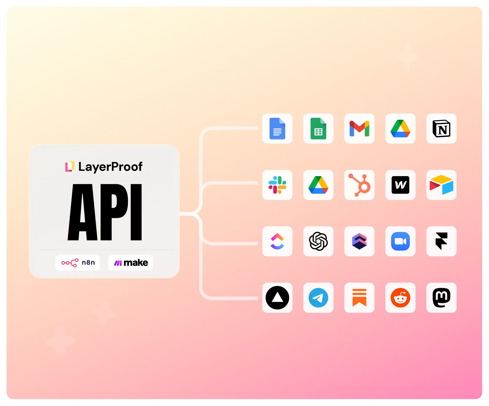 Set up in your workflowsLink LayerProof to the apps you already use like Make or n8n via API to start your automation.